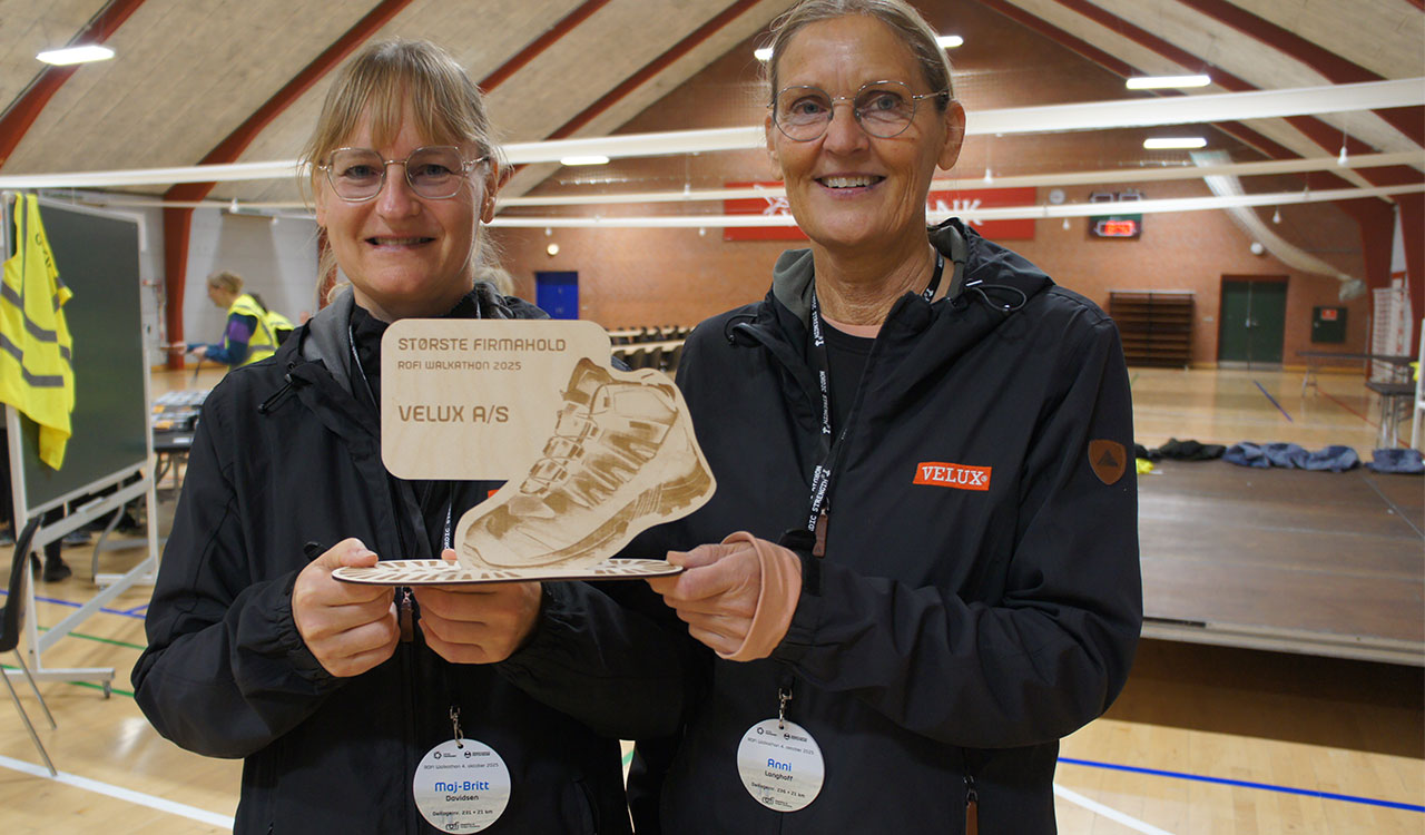 Velux var det største. Med 15 tilmeldte var Velux A/S Skjern det største firmahold ved ROFI Walkathon 2025. Dermed sikrede Velux sig den pokal, som ROFI skænkede til det firma, der samlet tilmeldte flest deltagere. Det var naturligvis ”en vandrepokal”, som dog kunne tages med hjem til ejendom. De fleste af deltagerne fra Velux Skjern gik den halve maraton på 21 km – blandt dem Maj-Britt Davidsen (tv) og Anni Langhoff, der her på firmaets vegne ses med vandrepokalen. | ![]() |