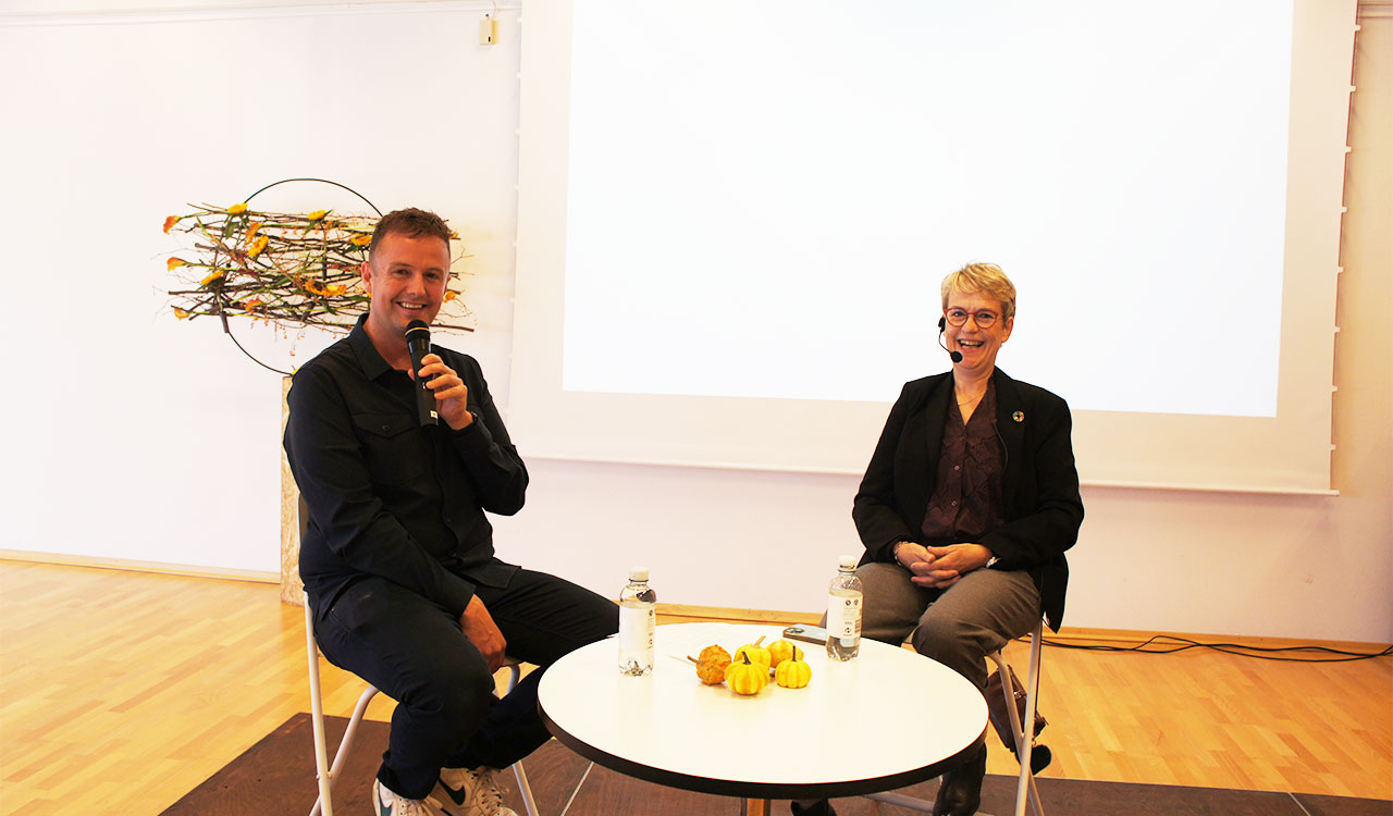 Journalist på TV-Midt Vest og musiker, Anders Toft Bro, var hyret til at underholde ledsagerne i ROFI-Centrets multisal, mens kvægavlerne holdt årsmøde i centrets Green Sports Arena. Det blev i den grad en fornøjelig omgang, hvor Anders Toft Bro bl.a. viste glimt fra FOTOVOGNEN, som han – sammen med Vibeke Nipper – i en del år rejste rundt med i landsdelen. Afbrudt af fotografen er Anders ellers her i gang med at interviewe Lone Andersen, Lyhne, der er tidligere næstformand i Landbrug og Fødevarer og nu borgmesterkandidat til det forestående kommunalvalg i Ringkøbing-Skjern Kommune. | ![]() |