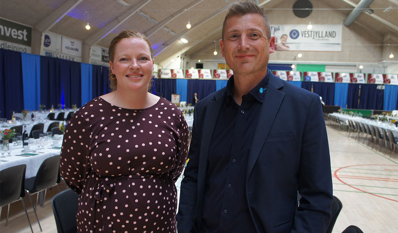 Administrerende direktør i Dansk Holstein, Nanna Hammershøj Christoffersen, og Steen Fjordside, der er sekretær i den lokale Ringkøbing-afdeling af avlsforeningen, var to af tovholderne på foreningens årsmøde. Her ses de, lige før aftenfesten gik i gang. | ![]() |