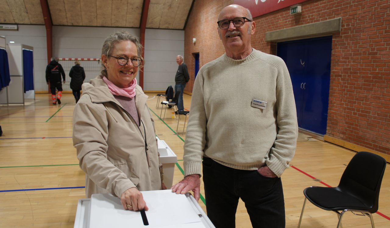 | Her har Birgitte Gyldenberg, der bor på Ahornvej i Ringkøbing, netop lagt sin stemmeseddel i boksen. Hun ses sammen med Per Axelsen, der var en af de tilforordnede, der klarede den praktiske afvikling af valget i ROFI-Centret. | ![]() |