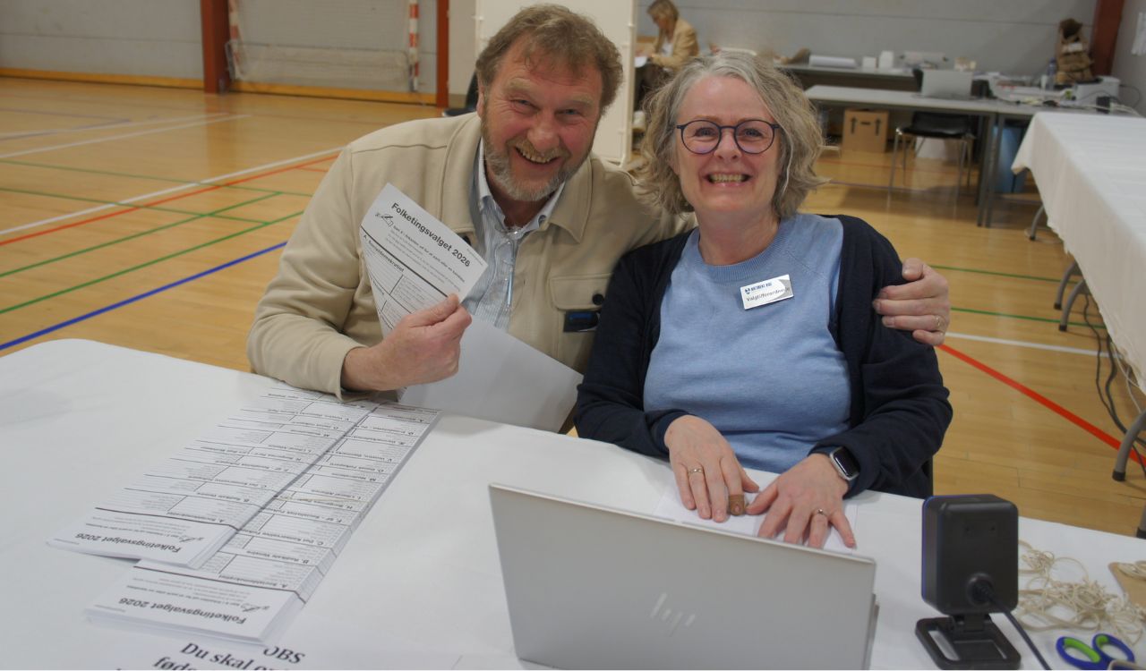 | Godt humør på valgdagen i ROFI-Centret, hvor byrådsmedlem Jens Erik Damgaard og borgmestersekretær Charlotte Coles var to af de i alt ca. 30 tilforordnede, der klarede den praktiske afvikling af valget. | ![]() |