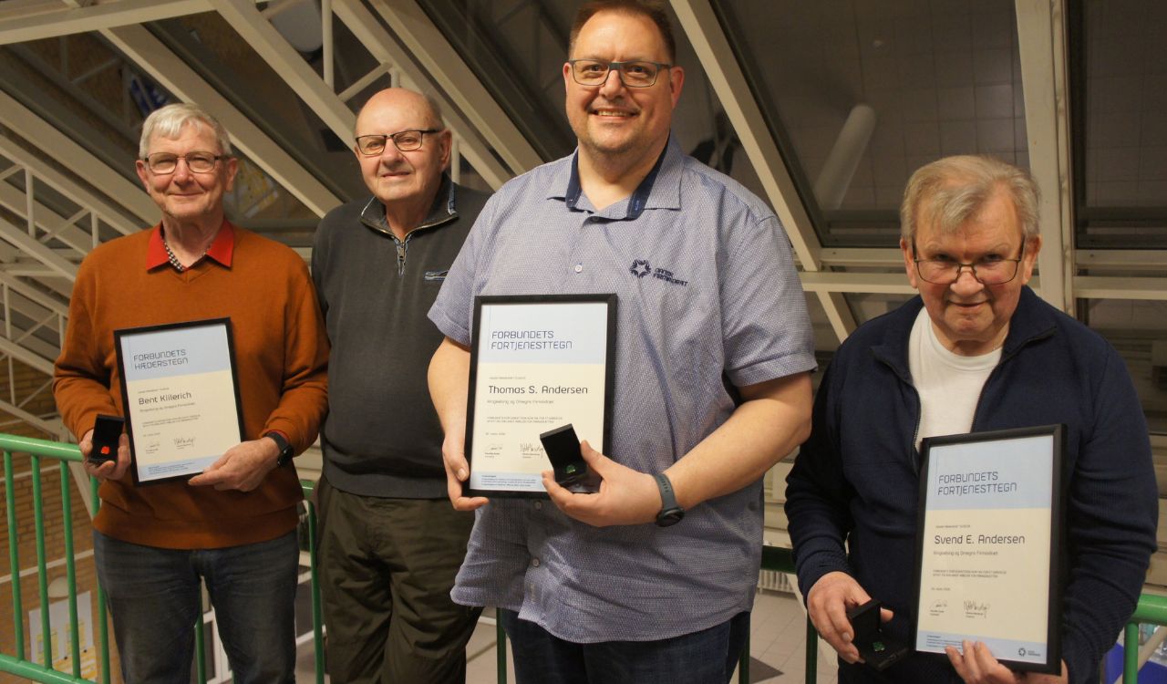 Fire af de fem, der blev hædret med tegn på ROFIs generalforsamling. Fra venstre Bent Killerich med firmaidrættens hæderstegn, Svend Bang Andersen, der fik fortjensttegnet, Thomas S. Andersen, der fik fortjenstegnet, og Svend Erik Andersen, der også fik fortjensttegnet. Berit Simonsen, der fik hæderstegnet, var ikke til stede ved generalforsamlingen.. |