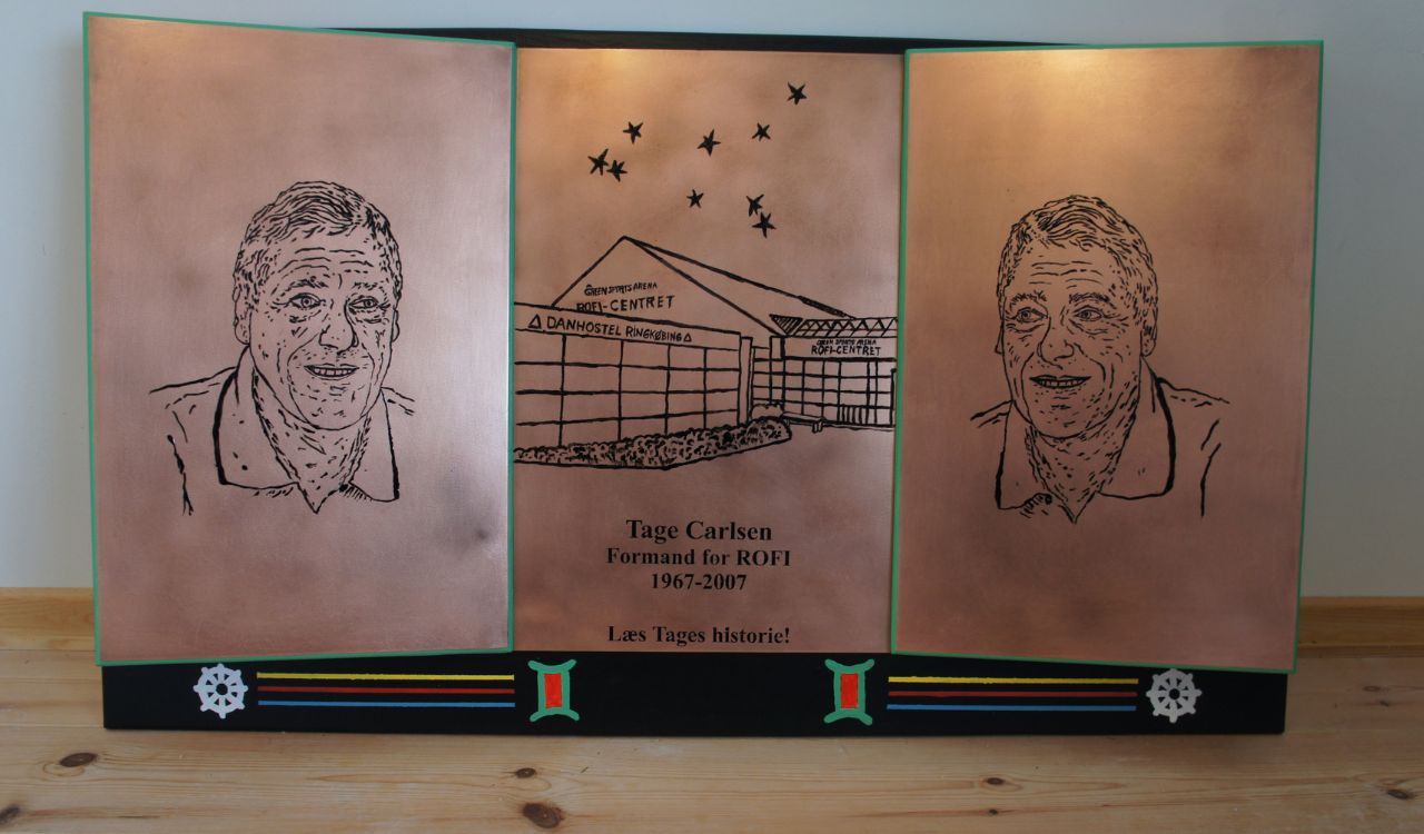 Leo Andersens kunstværk af Tage Carlsen, før det blev hængt op på sin blivende plads i ROFI-Centrets foyer. Værket, der er lavet i kobber, symboliserer, at Tage var født i Tvillingernes tegn. I midten en stregtegning af ROFI-Centret, som blev til med ham som primus motor. I bunden af billedet er der symboler på ”fødsel” og ”død” og med livslinjer imellem i forskellige farver. |