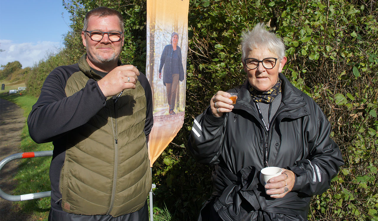 Ægtepar fra Skjern. Når Jonna og Bo Jensen, der bor i Skjern, har spist aftensmad, går de som regel hver aften en tur på 5 km. I år var de for første gang med i ROFI Walkathon, hvor de tilmeldte sig ruten på de 12 km. – Det er en dejlig tur i flot natur. Vi satser på at være med igen næste år og håber, at vi måske på et tidspunkt kan klare den hele maraton på de godt 42 km, sagde Bo og Jonna ved det sidste depot i Sorte Bakker før målet i ROFI-Centret. Her nyder ægteparret et lille glas whisky, som Stauning Whisky donerede til det gode formål. |