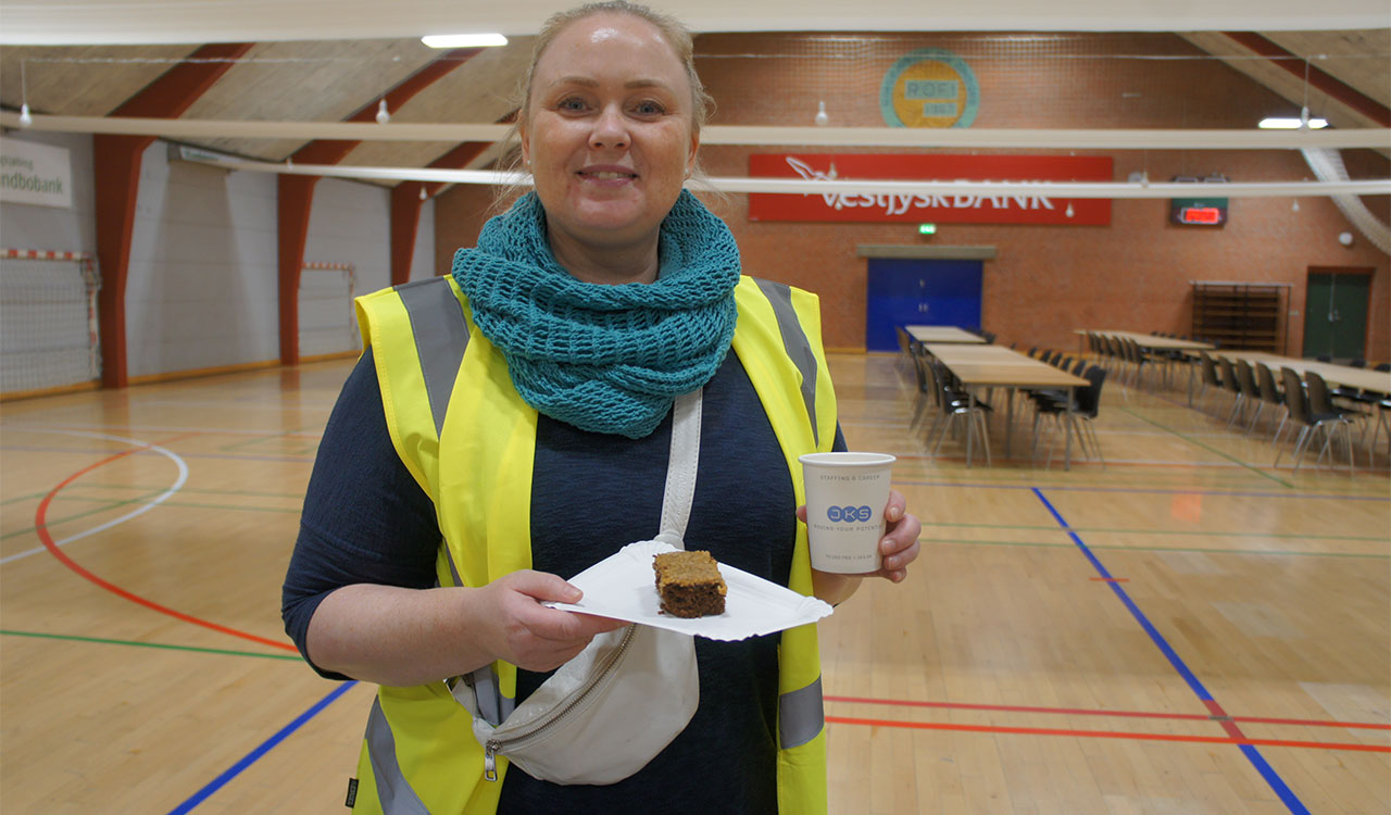 Kaffe og kage til alle. Der var kaffe og kage til alle deltagere, efter at de var nået i mål i ROFI-Centret. Her serverer lederen af ROFI Fitness, Ulla Birkmose, der var en af tovholderne på ROFI Walkathon 2025. |