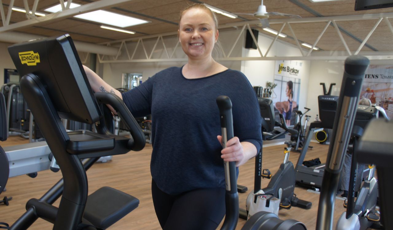 Der er indkøbt en række nye maskiner til ROFI Fitness i det forløbne år. Her ses lederen af fitnesscentret, Ulla Birkmose, på en af dem. |